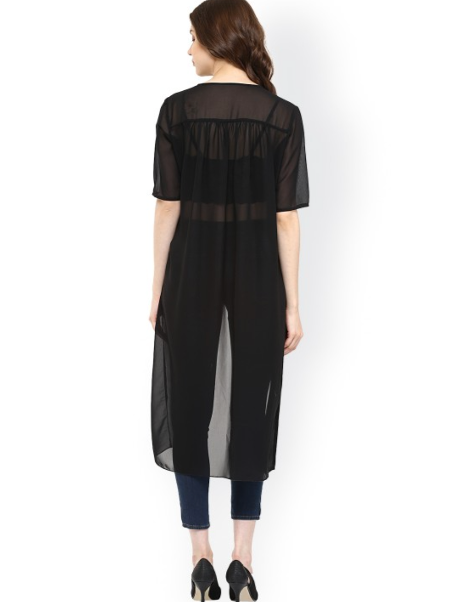 Black woven high-low sheer top, has a round neck, short sleeves, gathered detail on the front and back, high-low hem