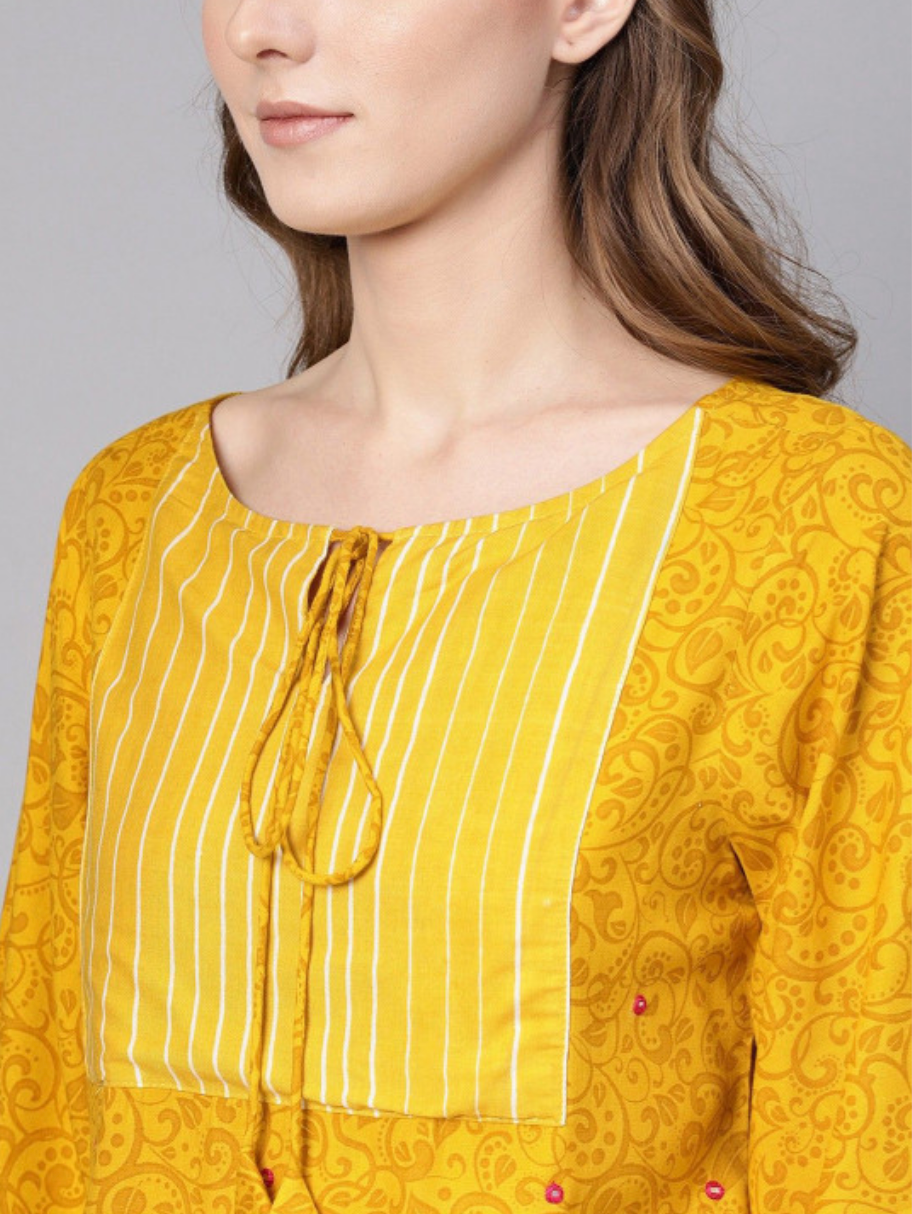 Yellow regular top, Ethnic print, Keyhole neck, long, kimono sleeves, Woven